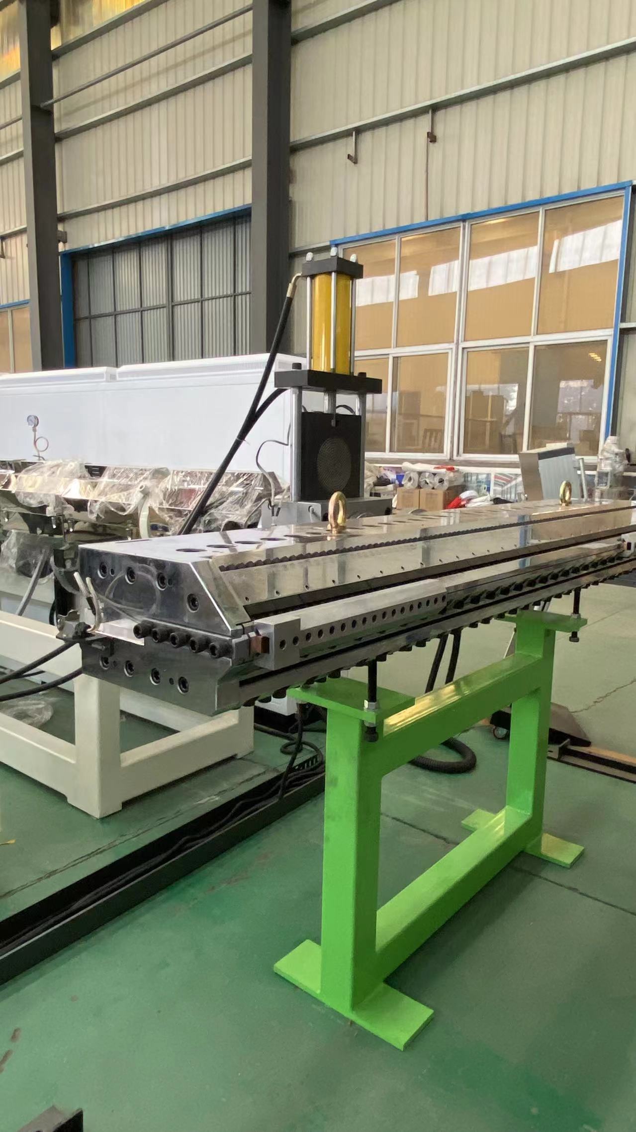 Производна линијаКомпозитна глава матрице има структуру у облику слова Т и произведена је од челика за калупе П20, са храпавостом површине канала протока од Ра 0,05 μм. Глава матрице има девет грејних зона, грејну снагу од 27 кВ и максималну производну ширину од 1300 мм, што омогућава прецизну контролу дебљине и равности екструдираног ПЕ језгра. Каландер са три ваљка има ефективну димензију радне површине 500 × 1.500 мм. Брзина линије се може прецизно подесити од 0,5 до 8 м/мин помоћу АББ система за контролу променљиве брзине, обезбеђујући глатку површину листа.