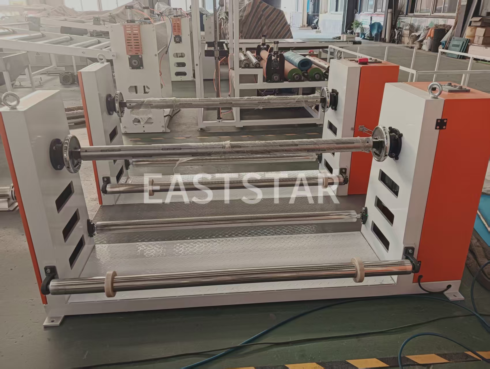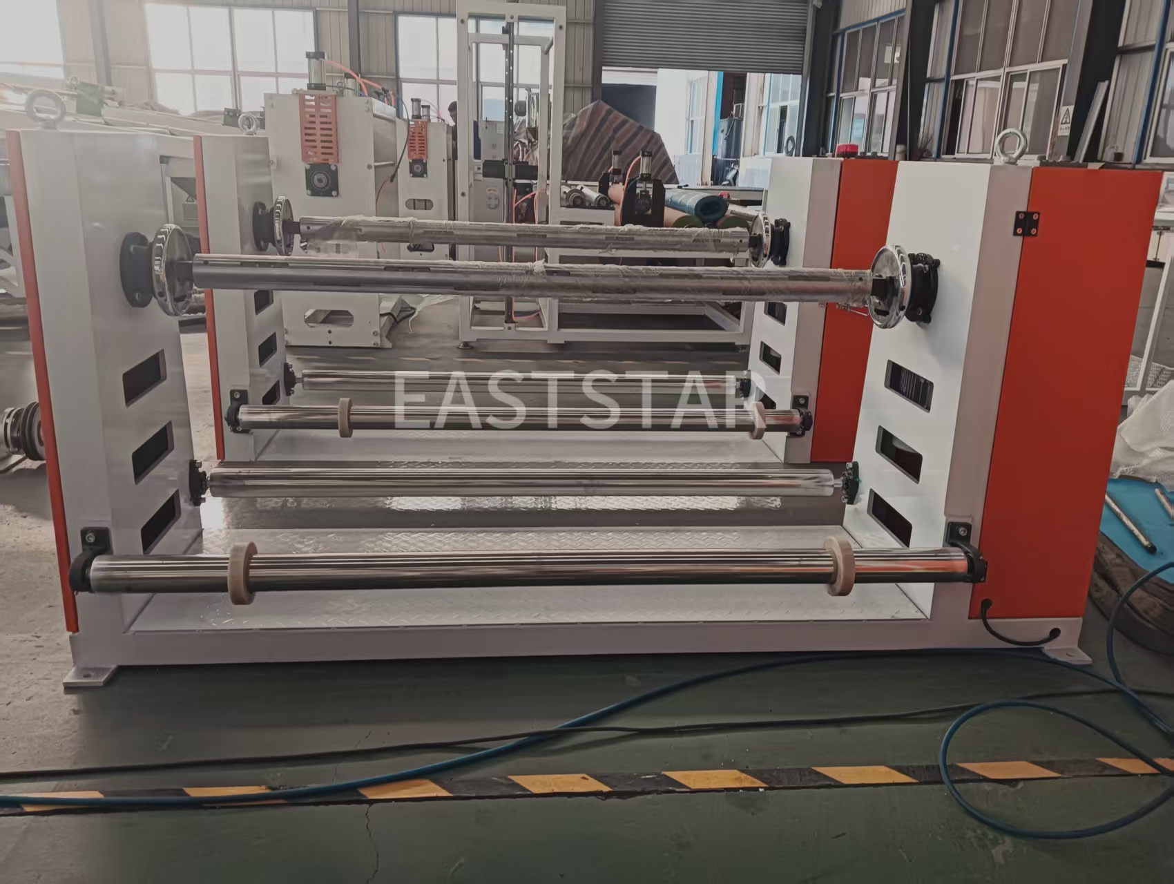 Систем за контролу температуре на ваљцима користи омекшану чисту воду као медијум, са тачношћу контроле температуре од ±1℃, и опремљен је пумпом за топлу воду од 2,2КВ и три сета грејача од 9КВ. Уређај за одмотавање са две станице је опремљен пнеуматским вратилом и системом контроле затезања за постизање континуиране производње. Тхепроизводна линија водоотпорних мембранатакође је опремљен уређајем за обрезивање ивица и системом за намотавање отпадних ивица како би се обезбедиле уредне ивице производа.
