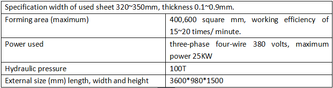 Технички параметар машине за прављење садница за расаднике Спецификација ширине коришћеног листа: 300 ~ 320 мм, дебљина: 0,8 ~ 2 мм. Површина формирања (максимално): 400*600 мм, радна ефикасност 15~20 пута/мин. Коришћена снага: трофазни четворожични 380 волти, максимална снага 25КВ Хидраулички притисак: 100Т Спољна величина (мм) дужина, ширина и висина) 3600мм*980мм*1500мм